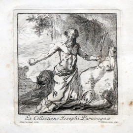 Raccolta di alcuni disegni del Barberi da Cento detto il Guercino, frontespizio della raccolta con al centro un'acquaforte raffigurante San Girolamo e il leone nel deserto, cm 52x32, Roma, 1764, entro cornice