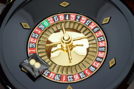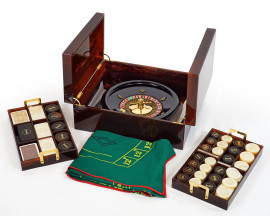Renzo Romagnoli, set completo per poker roulette, entro custodia in bachelite marrone, cm 16x41,5x34,5, XX secolo, (piccoli segni del tempo)
