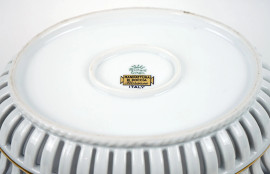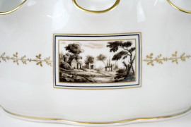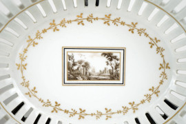 Richard Ginori, lotto di due oggetti in porcellana, composto da un centrotavola con profilo sagomato ed un cestino con fascia lavorata a traforo, riquadri raffiguranti paesaggi e finiture dorate, misure max cm h 15x31,5, (segni del tempo).
