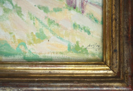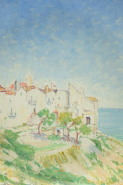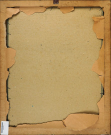 Scorcio costiero, tempera su tela riportata su cartone, cm 50,5x40,5, firmato, entro cornice.