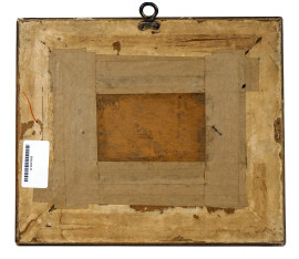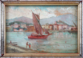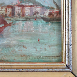 Scorcio di costa con imbarcazioni e figure, olio su tavola, cm 10x14,5, firmato, entro cornice.