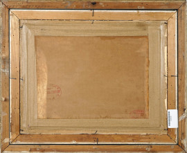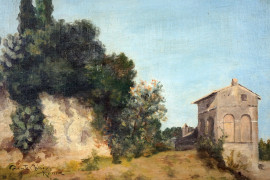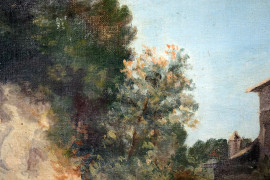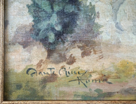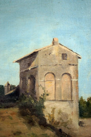 Scorcio di paese laziale, olio su cartone telato, cm 32x40, firmato, entro cornice.