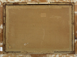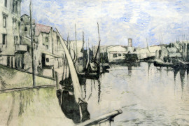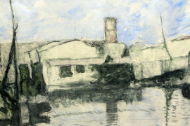 Scorcio di porticciolo, tecnica mista su cartoncino, cm 70x100, firmato, entro cornice.