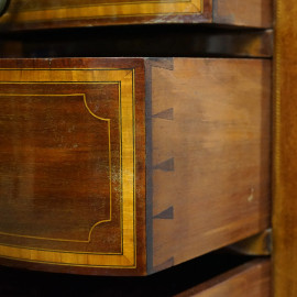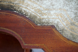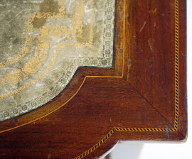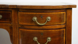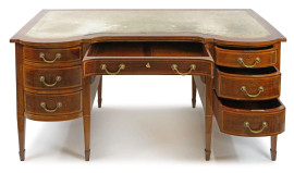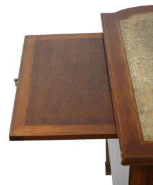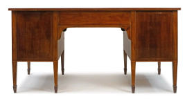 Scrittoio lastronato ed intarsiato in vari legni, fine XIX secolo, piano di linea sagomata con inserto in pelle, fronte a sette cassetti, otto gambe troncopiramidali, cm h 79x154x80,5, (segni del tempo).