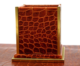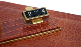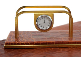 Set di tre accessori da scrivania in cuoio, composto da un portapenne, un sottomano ed un portalettere con calendario ed orologio, misure max cm 42x58,5, XX secolo, (segni di utilizzo).