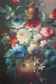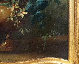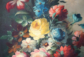 Sette dipinti raffiguranti vasi con fiori, olio su cartone e compensato, cm 36x22, firmati, entro cornici, (lievi difetti).