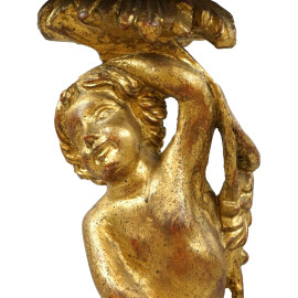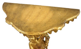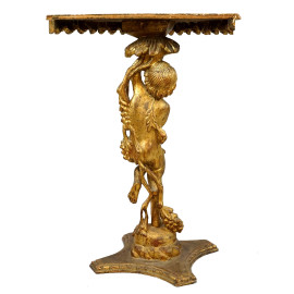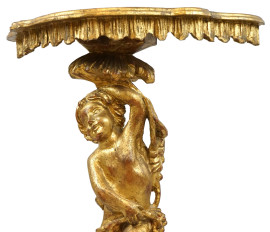 Tavolino in legno intagliato e dorato, XX secolo, piano sorretto da montante scolpito a foggia di putto, poggiante su pianetto alla base, cm h 71x53x29, (difetti).