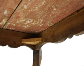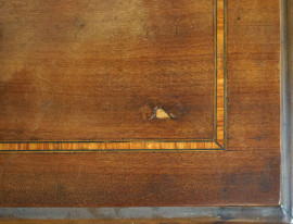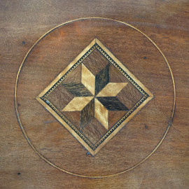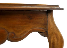 Tavolino in noce, fine XIX secolo, dettagli intarsiati, poggiante su quattro gambe mosse, cm h 71x76x46,5, (difetti).