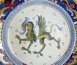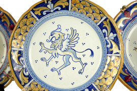 Tre piattini in ceramica a lustro raffiguranti grifoni, decori policromi, diam. cm 18,5, XX secolo, (difetti e restauri).