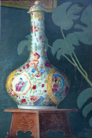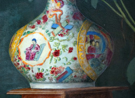 Vaso cinese, olio su cartone, cm 46x38, firmato, entro cornice.