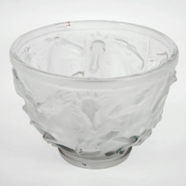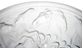 Vaso déco in vetro satinato con decoro di cavalli a rilievo, cm h 15, prima metà XX secolo.
