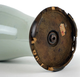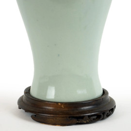 Vaso montato a lampada in porcellana verde, cm h 35,5, base in legno, Cina, XX secolo.