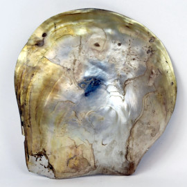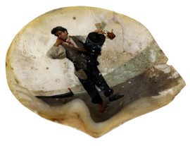 Venditore ambulante, dipinto su conchiglia, cm 13,5x13, (difetti).