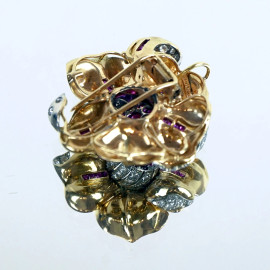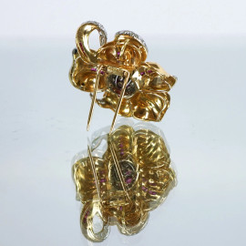 Ventrella, spilla in oro 18 KT a foggia di fiore con brillantini e rubini, gr.19,1