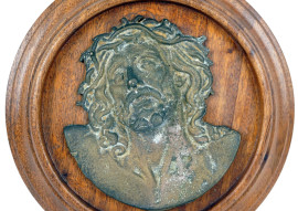 Volto di Cristo, placca in bronzo entro cornice in legno, cm 14x13, XX secolo, (lievi difetti).