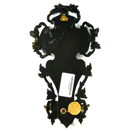 Acquasantiera in legno ebanizzato intagliato con crocifisso e vasca a foggia di conchiglia, cm 32x18,5, (difetti).