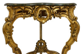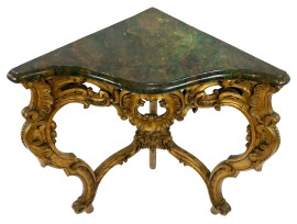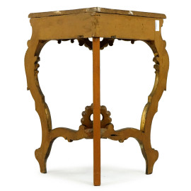 Angoliera in legno dorato, XIX secolo, piano in finto marmo, particolari scolpiti nella fascia a motivi floreali, cm h 86x75x52,5, (difetti).