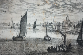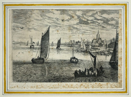 Antica incisione raffigurante marina con imbarcazioni, cm 20x28,5, entro cornice, (macchie diffuse)