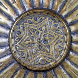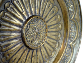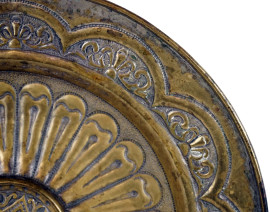 Antico piatto elemosiniere in metallo sbalzato e cesellato, diam. cm 36, (difetti).