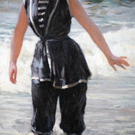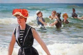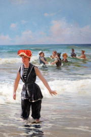 Bagnanti, olio su tavola, cm 39,5x27, firmato, entro cornice.