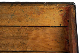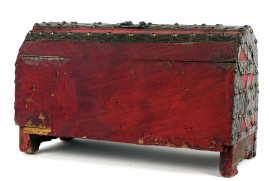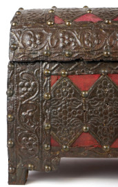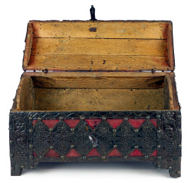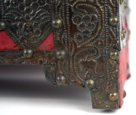 Bauletto da viaggio del XVII secolo, in legno rivestito in tessuto bordeaux e lamina di ferro sbalzata e cesellata, cm h 26,5x44,5x20,5,(difetti e segni del tempo).