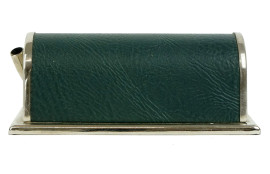 Calendario da tavolo in simil-pelle verde e metallo con portapenna, cm 5,5x16x9, XX secolo, (difetti)