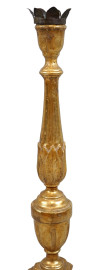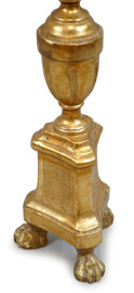 Candeliere in legno intagliato e dorato a mecca, tre piedi leonini, XIX secolo, cm h 57,5, (difetti).