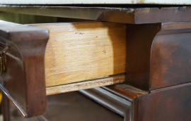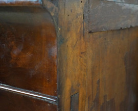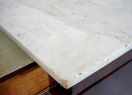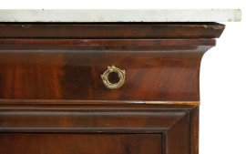 Comò in piuma di mogano, XIX secolo, piano in marmo bianco, fronte a quattro cassetti, cm h 107x133,5x67, (segni del tempo).