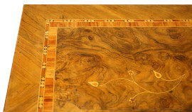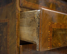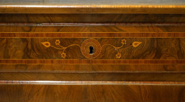 Comò Luigi XVI in legno impiallacciato ed intarsiato in varie essenze, piano di linea rettangolare, fronte a tre cassetti, cm h 87x120x56, (difetti).