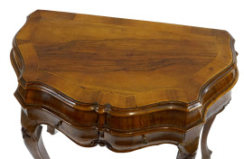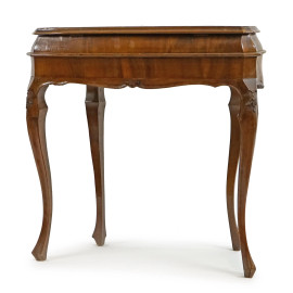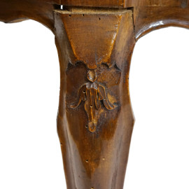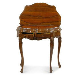 Comodino in noce di linea mossa e bombata, XX secolo, piano sagomato a ribalta, due cassetti nella fascia, gambe mosse con particolari intagliati, cm h 68x66x35, (difetti)