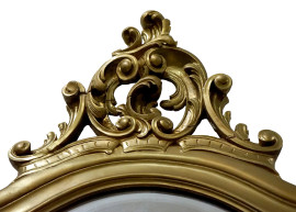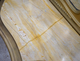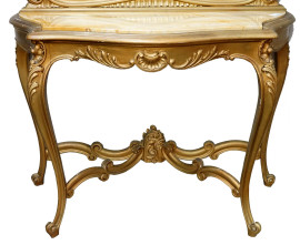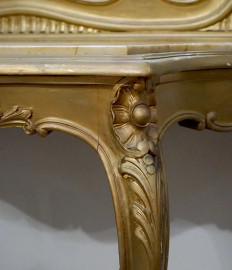 Consolle con specchiera Stile Luigi XVI, in legno intagliato e dorato, piano in marmo giallo di Siena incassato e sagomato, gambe a voluta riunite da travesa, cm h 271x115x44, (difetti)