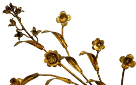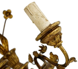 Coppia di appliques fiorentine a tre luci, XX secolo, in legno e metallo dorato, cm h 55, (difetti).