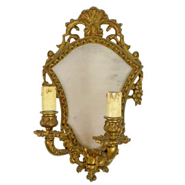 Coppia di appliques in metallo dorato a due luci, XX secolo, cm h 33x18,5, (difetti)