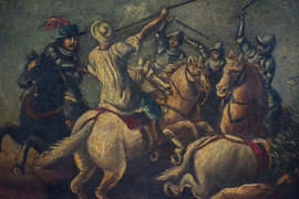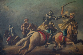 Coppia di battaglie, olio su tavola, cm 15,5x23, XX secolo, entro cornici