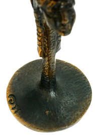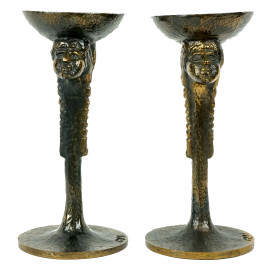 Coppia di calici déco in bronzo, decoro di doppio volto femminile stilizzato, cm h 18, siglati alla base.