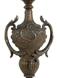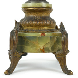 Coppia di candelabri a cinque fiamme in antimonio ed onice, XX secolo, cm h 67 (difetti)