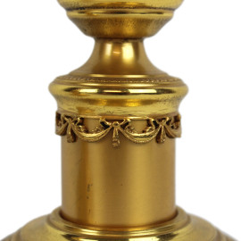 Coppia di candelieri in argento dorato, metà XX secolo, decori cesellati, fusto a colonna in quarzo rosa, cm h 23