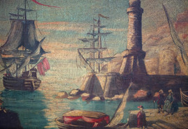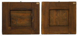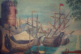 Coppia di marine con castello e imbarcazioni, olio su tavola, cm 20x24,5, XX secolo, entro cornici.