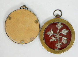 Coppia di ricami raffiguranti fiori, entro cornici tonde, diam. cm 9