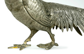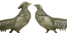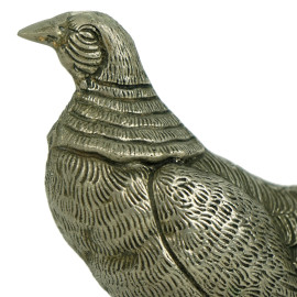 Coppia di sculture in metallo raffiguranti fagiani, cm h 13x27,5, XX secolo.