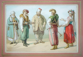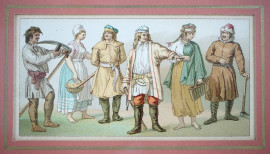Coppia di stampe a colori raffiguranti personaggi con costumi tradizionali, cm 10x15,5, XX secolo, entro cornici.