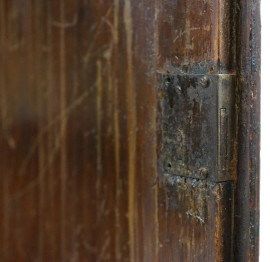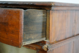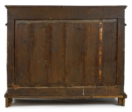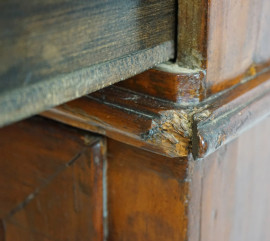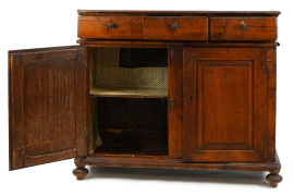 Credenza in legno dolce tinto a noce, XIX secolo, fronte a tre cassetti e due sportelli, cm h 105x118x42, (difetti).