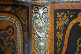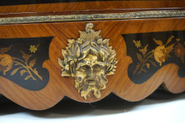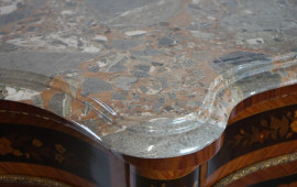 Credenza stile Napoleone III, intarsiata in varie essenze, piano sagomato in marmo, applicazioni in bronzo dorato, cm h 111x118x45