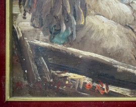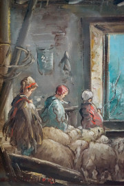 Pastorelli nell'ovile, olio su tavola, cm 35x25, entro cornici.
