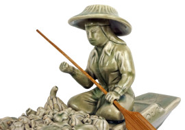 Fruttivendola thailandese sulla barca, scultura in maiolica, cm h 17x33,5x10, arte orientale, XX secolo