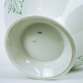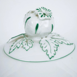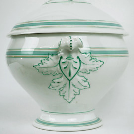 Ginori, zuppiera in porcellana bianca e verde, coperchio e prese laterali a decoro di frutta e foglie, cm h 30, inizi XX secolo.