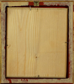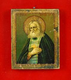 Icona raffigurante Santo, stampa applicata su tavola, cm 9x7, XX secolo, entro cornice