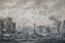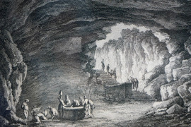 Lotto composta da due stampe francesi raffiguranti "Port & Ville de Gallipoli, sur Le Golfe de Tarente" e " Grotte aucienneueur taillée daus les Rochers pres de l'antique Ville de Mandurium dans la Grece", misure max cm 19x24, XIX secolo, entro cornici