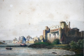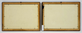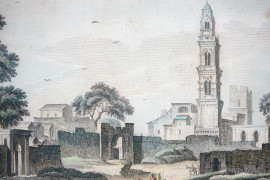Lotto composto da due antiche stampe francesi raffiguranti "Village de la Terre d'Otrante" e "Port et chateau de Brindes", cm 15x22, entro cornici, (macchie)
