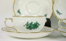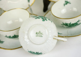 Lotto composto da tre tazze da thè e sei piattini in porcellana Rosenthal, decori floreali in verde, finiture dorate, XX secolo, (lievi sbeccature)